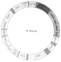 L’ADN mitochondrial (ADN mt) est présent dans la matrice des mitochondries. C’est une molécule circulaire, fermée par liaison covalente. Elle mesure environ 5 mm de long. Constitué de 16569 paires de bases, sa masse est de 107 daltons. C’est un ADN très petit par rapport aux 3.109 paires de bases de l’ADN nucléaire.